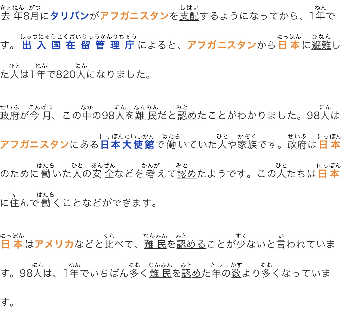 政府が今月、この中の98人を難民だと認めたことがわかりました。98人はアフガニスタンにある日本大使館で働いていた人や家族です。政府は日本のために働いた人の安全などを考えて認めたようです。この人たちは日本に住んで働くことなどができます。