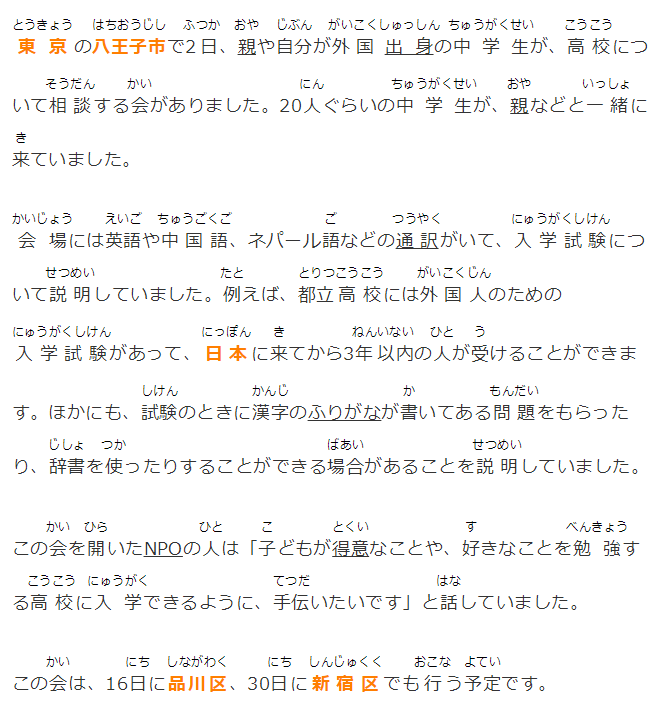 この中で、都立高校の外国人の特別枠は、来日して3年以内などの応募資格があることや漢字にルビがふられた試験問題や辞書の持ち込みが認められるケースもあることなどが説明されました。
