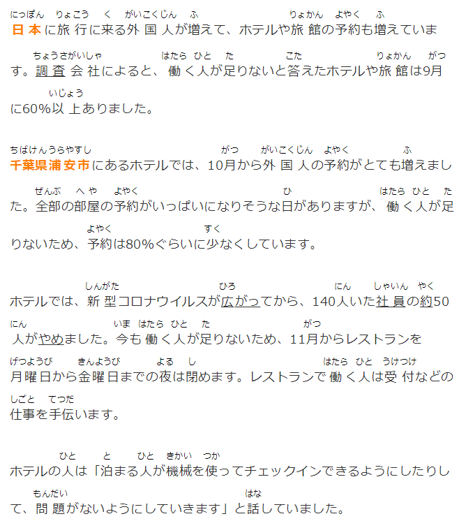 千葉県浦安市にあるホテルでは、10月から外国人の予約がとても増えました。全部の部屋の予約がいっぱいになりそうな日がありますが、働く人が足りないため、予約は80%ぐらいに少なくしています。
