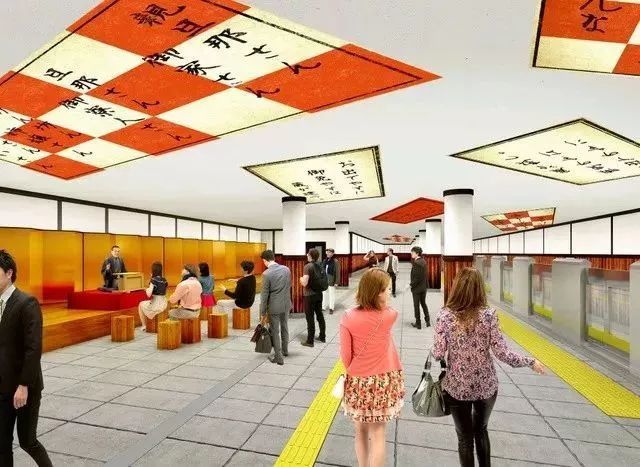 “堺筋本町站”虽以“船场町人文化”为理念,计划在天花板上装饰町人话语,但此次改为木纹墙壁创造沉稳的氛围。