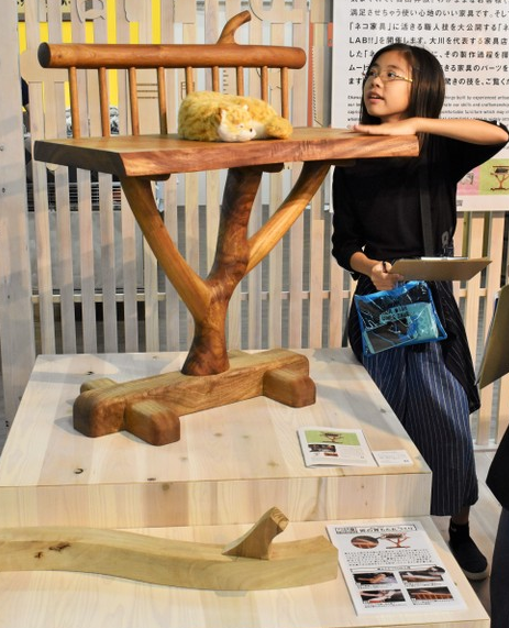 大川产业会馆的一角,设置着销售人气猫咪家具的展位“猫咪家具LAB!!”。展示着包括4件新作在内的10件家具。