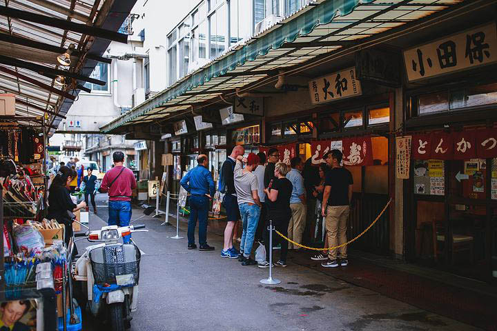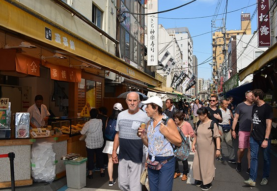 在筑地,场外市场林立着餐饮、鲜鱼、餐具类、刃具等约460家店铺。筑地市场搬迁之前,这里曾从早热闹到晚。现在,受益于英式橄榄球世界杯赛(Rugby World Cup)的影响,众多外国观光客正造访于此,乍一看,这里仿佛与以往并没有不同。然而,随着进货之余顺道过来的日本顾客减少,筑地场外市场的销售额已较上年同期减少了约2成,行人寥寥的状况也并不少见。因此各家店铺不会对这样的情况坐视不理。