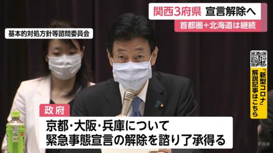 在5月21日晚上的政府对策本部会议中,依据应对新冠肺炎疫情的《特别措施法》,日本政府正式决定解除新增感染者减少的京都、大阪、兵库3个府县的紧急状态。