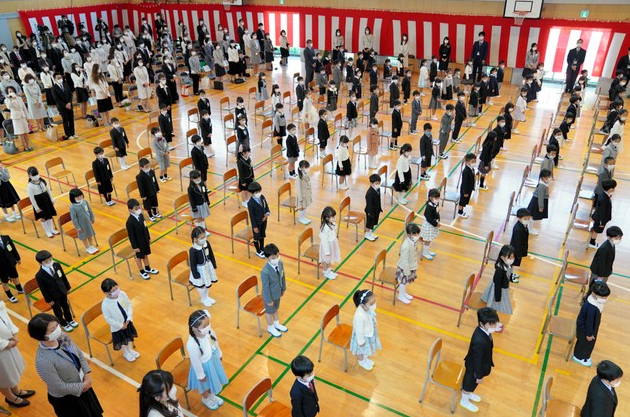 在新冠肺炎疫情在日本不断扩大的时刻,位于横滨市绿区的市立中山小学于6日举行了入学仪式,106名一年级新生戴着口罩走进了校门。