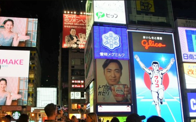 在被称为大阪象征的繁华街——道顿堀,其华丽的海报看板正被数字化电子屏幕所替代。电子屏幕可播放视频广告,也可每周更换广告内容。