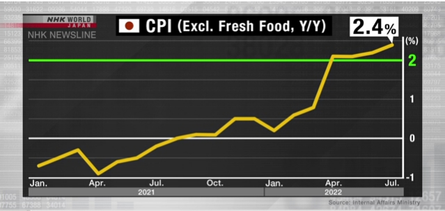 日前,日本总务省公布了今年7月的居民消费物价指数(CPI)。以2020年为基数100,除去生鲜食品数据的指数今年7月为102.2,与去年同期相比上涨2.4%,连续11个月上涨。
