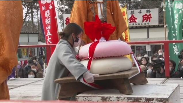 近日,位于日本京都市伏见区的世界遗产醍醐寺举办了一项名为“抬年糕”的传统活动。参加这项活动的人们在活动中抬起重达约150公斤的新年祭祀用的巨型年糕,以祈求无病无灾、身体健康。