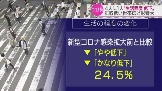 日前,根据日本独立行政法人“劳动政策研究及研修机构”的一项持续性调查显示,截至2021年6月,当问到被调查者认为生活水平与新冠疫情期间相比有什么变化时,答案为“稍有下降”或“大幅下降”的人占比24.5%。