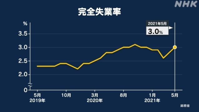 截至今年5月,日本全国完全失业率时隔4个月达到了3.0%,环比上升了0.2个百分点。对此,日本总务省分析认为,日本的就业形势“受新冠疫情影响,形势依旧严峻”。