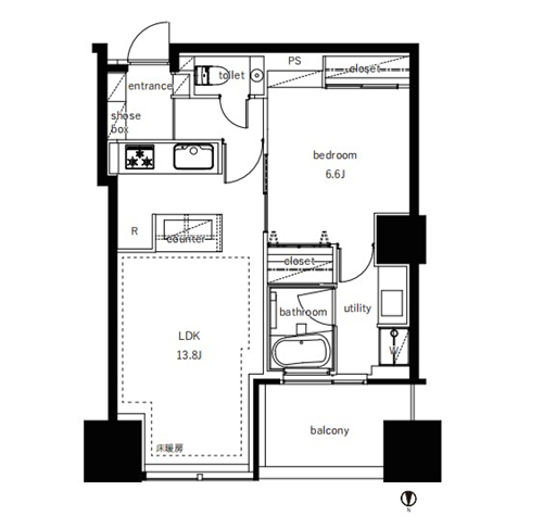 2009年2月建成的大规模高层公寓,永久产权,符合新抗震标准。位于东京都江东区,近邻东京メトロ有乐町线【豊洲】站,车站周边汇集了复合商业设施,还有与公寓楼相邻的大型超市,附近设有沿着公园和运河的散步道,便利的居住环境。公寓楼地上48层付地下1层, 设有门禁、快递柜,24小时有人管理,客室、观影室、卡拉ok室等共用设施充实,有驻车场,可饲养宠物(有细规)。公寓位于26层,视野开阔,52.50㎡1室1厅,客餐厅有地暖,卫浴独立,详情欢迎咨询。海外客户可以申请日本银行贷款购房,目前有两种方式:1.需要在日本设立公司,以法人名义购买,贷款额度约60-70%、还款周期25-35年、贷款利率1.5%起。2.个人名义购买,海外客户可以申请日本个人抵押贷款购房,不需要设立公司,贷款额度约50-60%,还款周期15-25年,贷款年龄65岁以内,贷款额度不能低于2000万日元,贷款利率2.7%起。