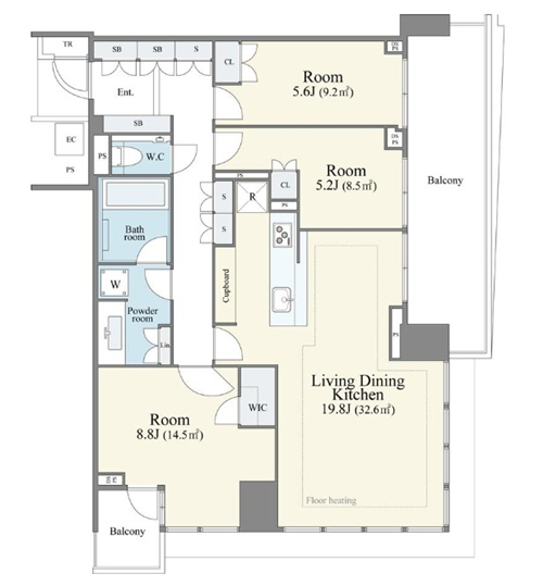2016年6月建成,永久产权,符合新抗震标准。位于东京都江东区,2线2站可以利用,近邻【豊洲】站、【新豊洲】站。公寓楼沿着运河,地上32层,设有门禁、快递柜及驻车场,大厅有前台接待服务,客室、健身房、游泳池、空中休息室等共用设施充实,可饲养宠物(有细规)。公寓位于26层,3室1厅角住户,东南2面阳台,视野开阔,2024年8月完成室内翻新,客餐厅有地暖,步入式衣帽间等收纳充实,卫浴独立,详情欢迎咨询。海外客户可以申请日本银行贷款购房,目前有两种方式:1.需要在日本设立公司,以法人名义购买,贷款额度约60-70%、还款周期25-35年、贷款利率1.5%起。2.个人名义购买,海外客户可以申请日本个人抵押贷款购房,不需要设立公司,贷款额度约50-60%,还款周期15-25年,贷款年龄65岁以内,贷款额度不能低于2000万日元,贷款利率2.7%起。