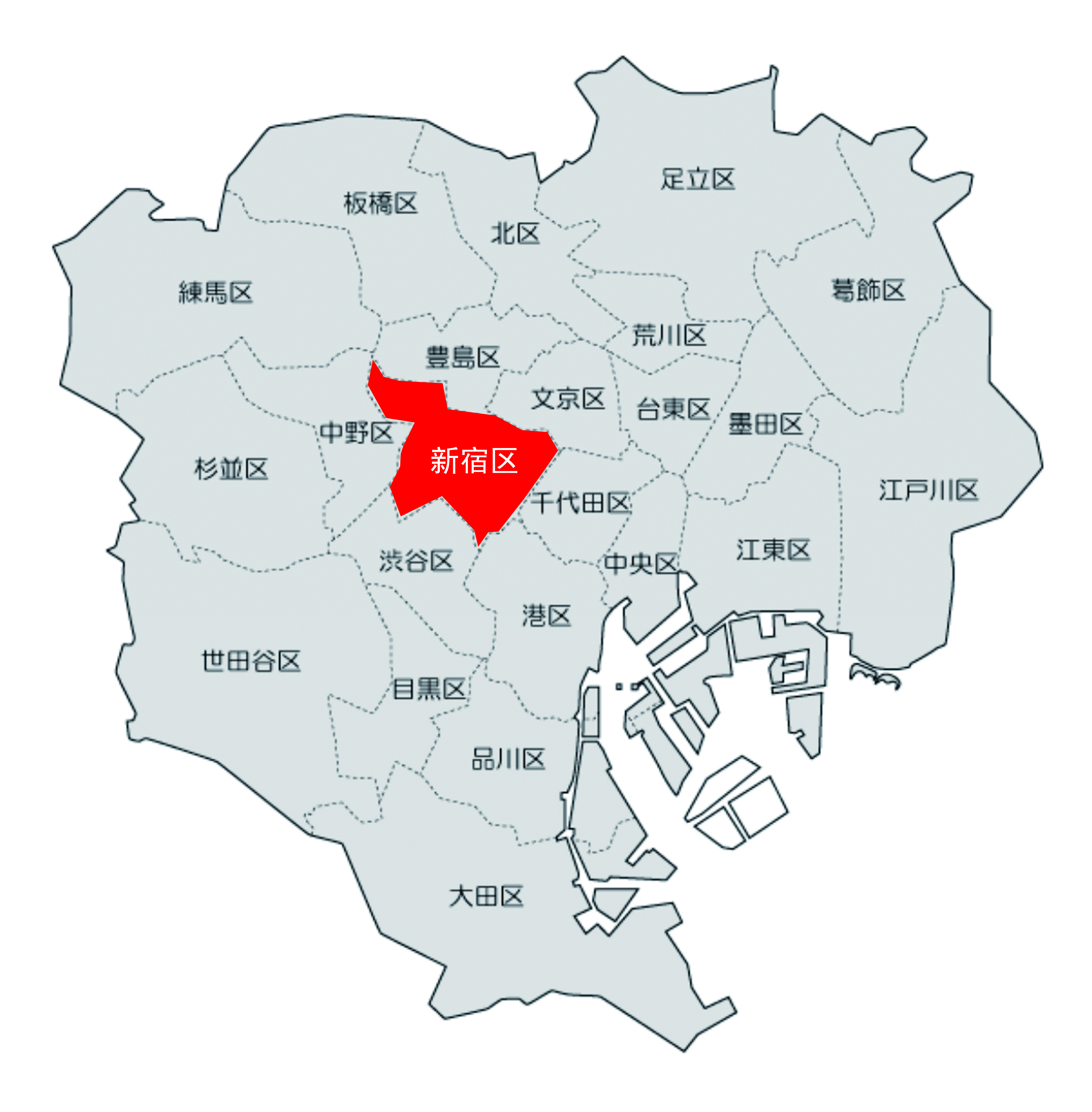 新宿区:新宿区位于东京23区副都心的位置,该区充满娱乐氛围,但是新宿的西口和东口两个地区却给人以完全不一样的印象。以都厅为首,新宿西口是一片高楼林立的商业区;新宿东口则以歌舞伎町为中心发展成了亚洲最大最繁华的娱乐一条街。在针对新宿区单身居住者的调查中,70%的居住者表示愿意继续居住在这里,因为新宿区的生活十分便利,从衣食住行到医疗、娱乐,该区都具备各项完善设施。