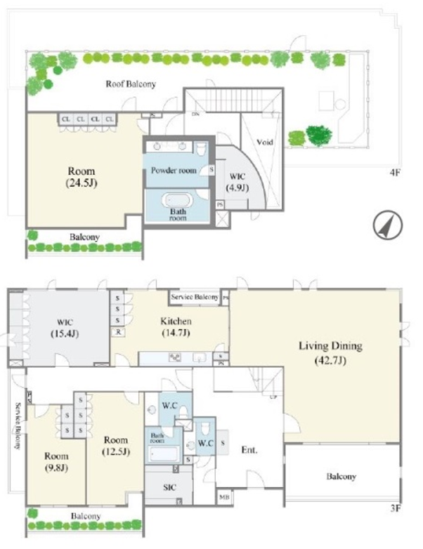 物件位于这栋四层建筑的3、4层部分,户型为三室一厅,室内带有开放感的屋顶阳台(四处阳台三面采光),采光通风极好。室内有三个卫生间和两个浴室,同时还有两个步入式衣柜(衣帽间)和一个步入式鞋柜,收纳充足,详情欢迎咨询。