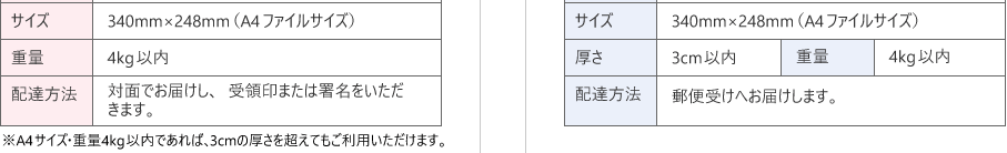两种共通规则,尺寸A4大小,340毫米乘以248毫米,重量最多4千克。注意!虽然重量上限很高,但有厚度限制。