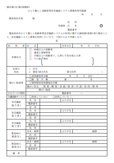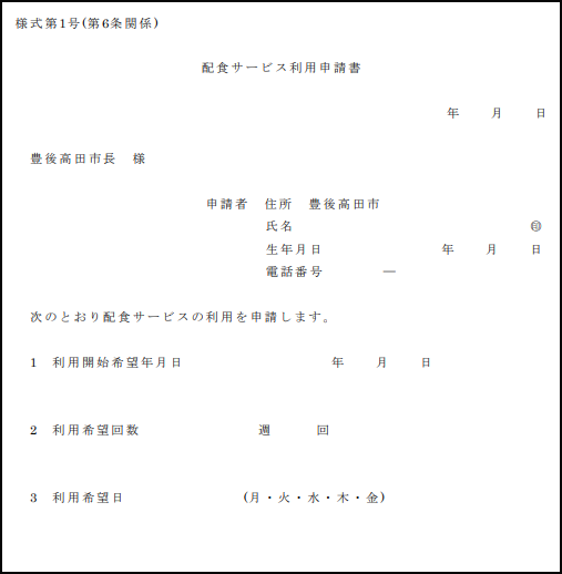 丰后高田市对65岁以上,独自生活的老年人或只有老年人的家庭及身体残疾人等为对象,由于衰老、身心障碍、伤病等理由,饮食调理困难,在接受支援确认或市长认为有支援必要的人,实施晚饭的配餐服务,配餐时间为每周一至周五的晚餐,餐费为每次360日元(约合22元人民币)。送餐时,送餐人员同时还对老年人进行安危确认。
