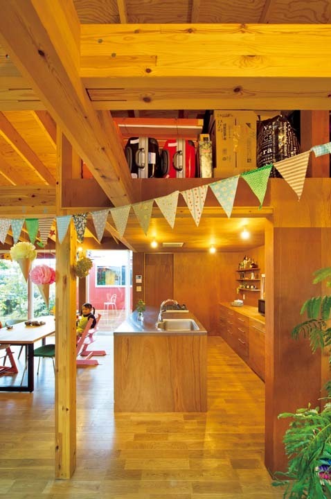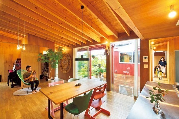 首先,将中庭圈成“コ”字的平房设计,这样屋内所有的空间都能近距离感受到大自然的绿色和泥土的芬芳,不但光照充足,还能随时享受与大自然融为一体的居住感受。中庭和房间连接在一起,高高的天花板营造出了更加开放的感觉。原本希望建造两层楼的S夫妇觉得与原计划相比,虽然整体的套内面积变小了,但是实际上也确保了足够的居住面积。最让人惊喜的是,房子内部设计为简约的打通空间,方便孩子小时候的玩耍和大人照看孩子,等孩子长大时可以根据需要增加隔断墙,变成相对私密的空间,挑高的屋顶甚至将来还可以增加阁楼空间,不失为匠心巧设。
