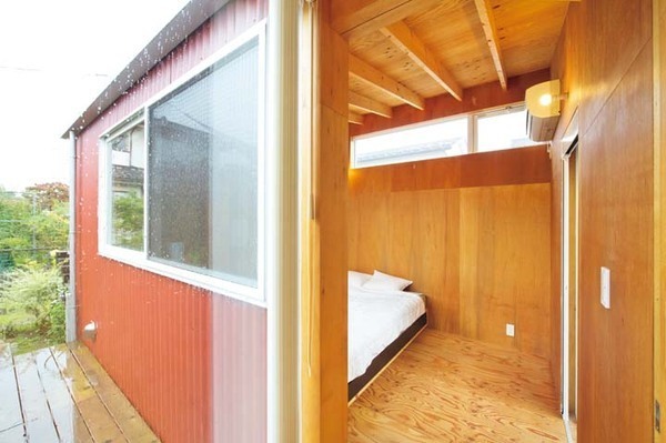 卧室和客厅由中庭相隔,动静分区,互不打扰的设计简单实用。而且这种半包围半封闭的布局,一方面可以有效保护家人隐私,一方面又能充分接触大自然,即使白天不拉窗帘也不会让外人窥探到屋内的情况,可以放心的开窗通风和享受阳光的照耀。只有面向街道一侧的墙壁使用了位置较高的窗户,这也是为了增加光照又同时保护了隐私。