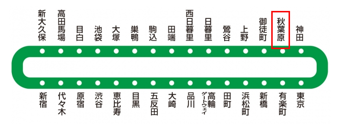 JR线的总武线月台在3楼,山手线、京滨东北线月台在2楼。 JR秋叶原车站有四个出口,包含电器街检票口(電気街改札)、中央检票口(中央改札)、昭和通检票口(昭和通改札)和atré1检票口(アトレ1改札)。