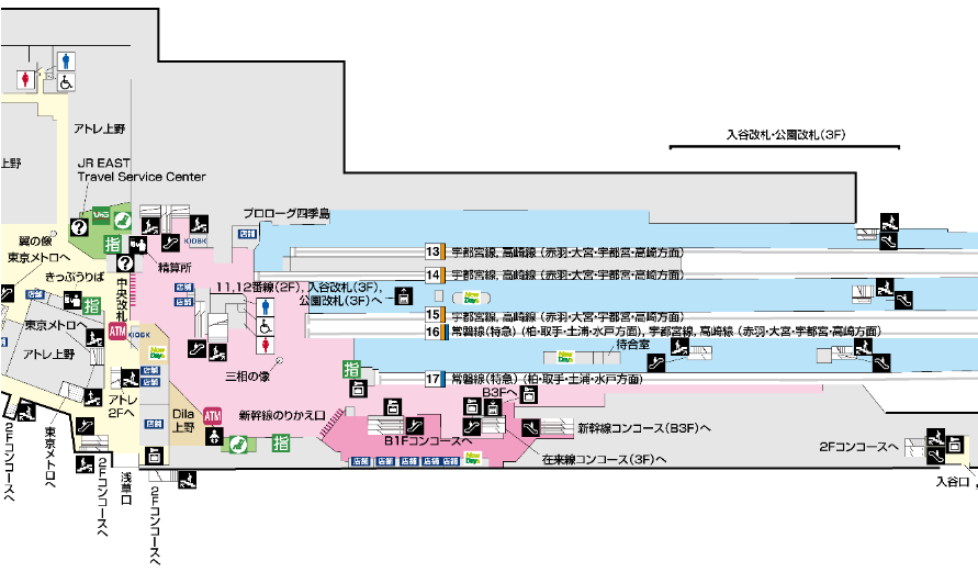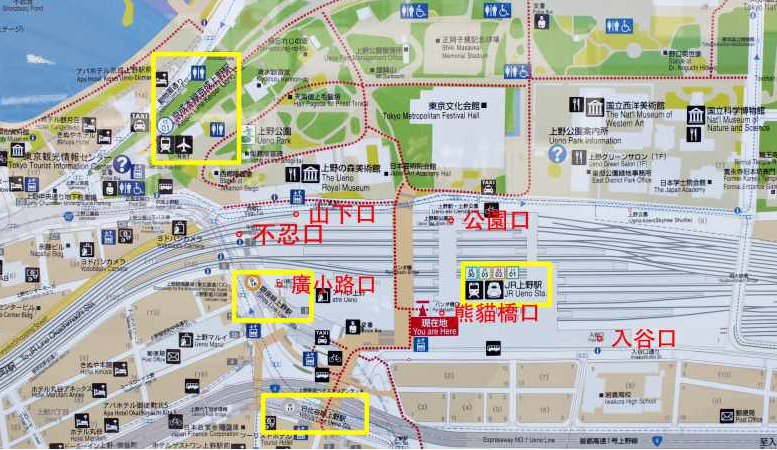 JR上野车站规模较大,地上3层、地下4层,通常从JR下车时是在2层月台,地下一般是新干线各站台。如果想去阿美横丁等的“中央检票口”、“不忍检票口”的话,可下到1层;前往上野公园的“公园检票口”的话,可以上到3层。但是如果出错检票口的话,可能就需要多走会儿才能到达目的地了。JR上野车站内的站台较多,如果担心迷路的话,建议从“中央检票口”出,这里不但是最大的检票口,而且出站后右手就有问讯处(Travel Service Center),问路也很方便。