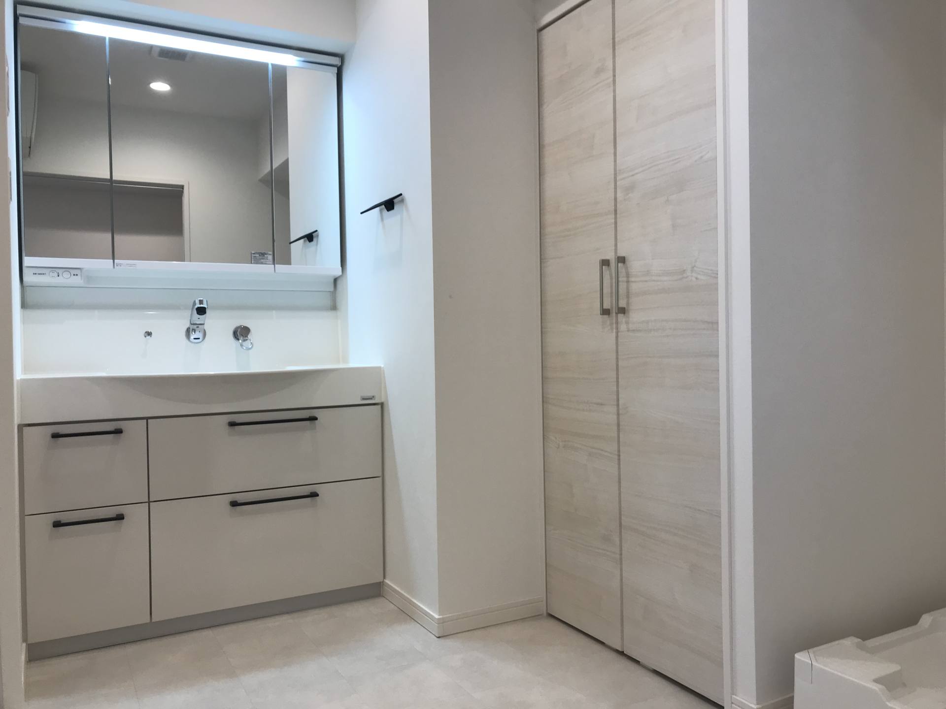 盥洗室通常有专门的洗面台、镜面灯、镜子、置物架或镜箱、洗面盆,水龙头以及洗面盆下面的收纳空间,配套完备、使用便利。