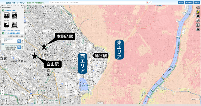 近年来,由于台风引起的河流泛滥,有时会有发生水灾的隐患。荒川泛滥时莺谷的整个东部区域都是被预测会浸水“1m~5m”的危险区域。所以如果在莺谷发现好房子时,尽可能租2~3层以上的房间会比较安全。地图上粉色系的部分有浸水风险,以下是国土交通省发布的“危险地图”。