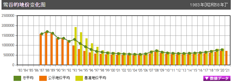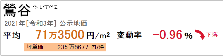 2021年莺谷的公示地价为每平方米71.35万日元,下跌0.96%,与往年相比变化不大。