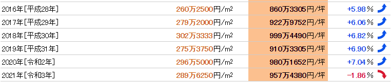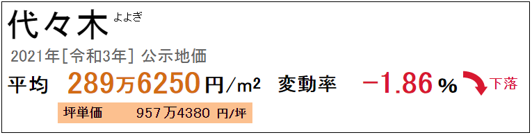 由于代代木周围商业实施众多,几乎没有新建住宅项目入市。所以地价多年来稳步上升,因受新冠肺炎疫情的影响略有下降,2021年公示地价为每平方米289.625万日元。