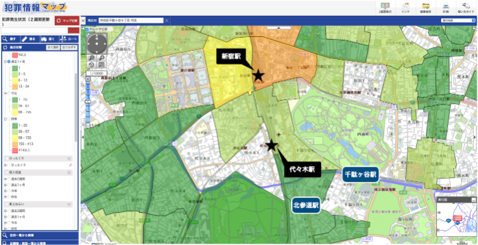 以下地图是警视厅发布的“犯罪信息地图”,车站附近区域黄绿场所也很多,一个月内犯罪数量也很多。