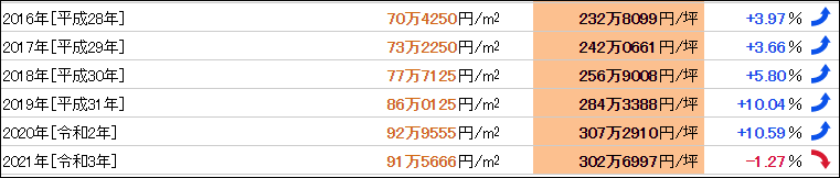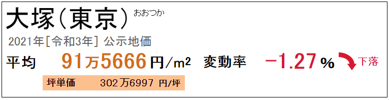 大冢的地价在城市中心的位置相对不高,2021年的公示地价为每平方米91.5666万日元。大冢的地价近年来持续稳定上升,因受新冠肺炎疫情的影响稍有下降,与去年同期相比下降了1.27%。