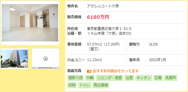 大冢车站周边的二手房房龄普遍偏老,距车站步行3分钟、2002年竣工的面积为57.07㎡的2LDK的二手房售价为6180万日元。