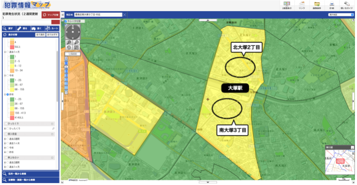 大冢附近的公寓很多,但是站前的治安较差。根据警视厅发布的“犯罪信息地图”,车站的区域被黄色包围,犯罪案件频发。