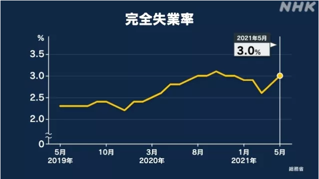 在今年3月,即紧急事态宣言解除后进行的调查中,日本的完全失业率曾跌至2.6%,之后又连续两个月出现了增长。根据日本总务省公布的数据显示,截至5月,日本国内的完全失业人数为211万人,日本全国完全失业率时隔4个月达到了3.0%,环比上升了0.2个百分点。(美国劳工部公布的数据,2021年05月美国失业率为5.8%。中国国家统计局公布的数据,2020年12月份,中国31个大城市城镇调查失业率为5.1%。)