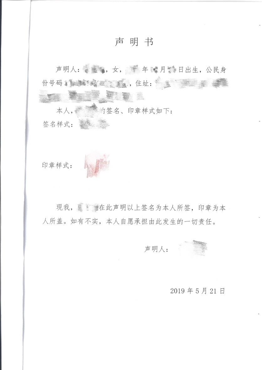 • 声明书中需包含与户口本上一致的住址,同时需买家本人现场签名及盖章。