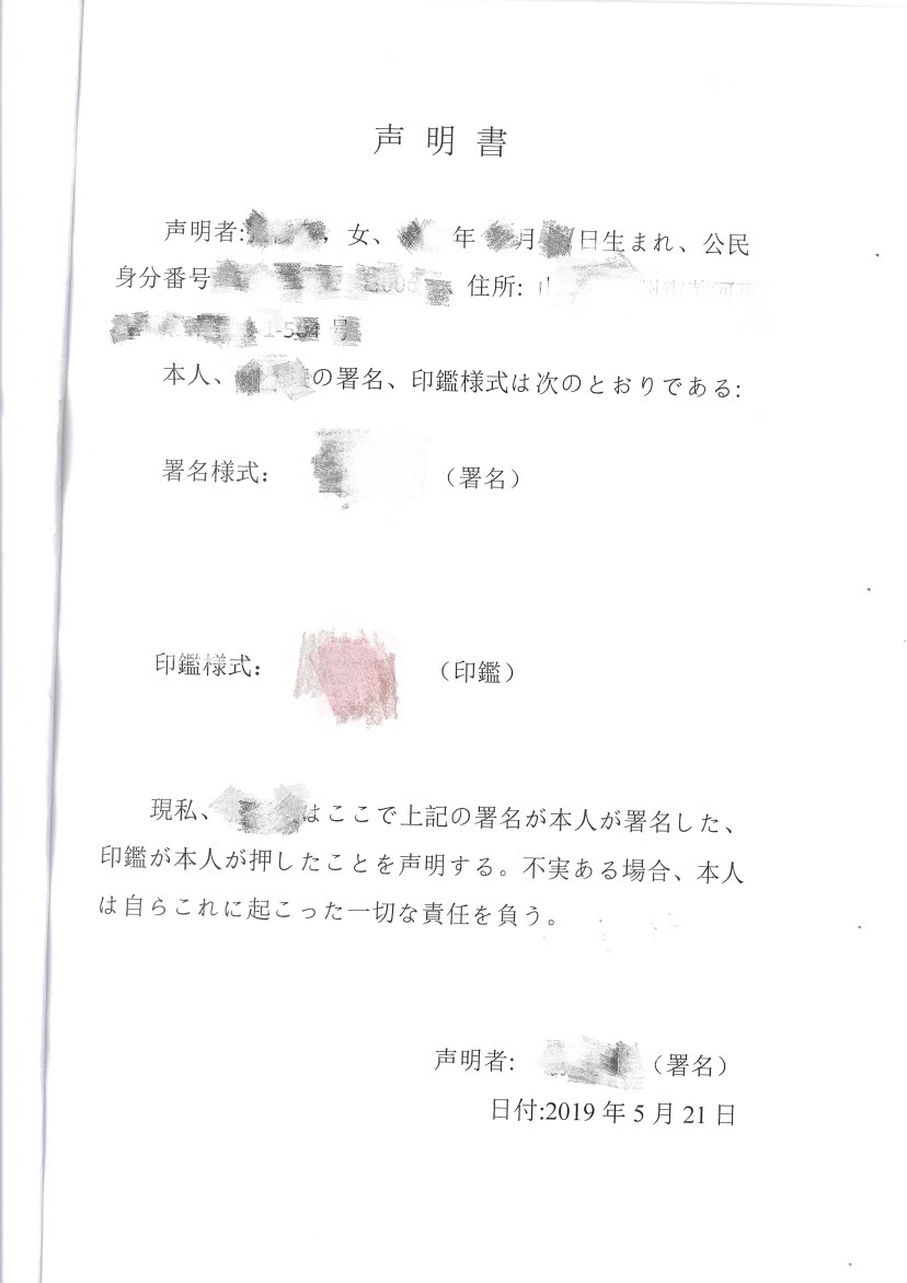 • 办理签名印章公证书,买家需要携带户口本、身份证原件、个人印章、中文声明书到所在地区的公证处进行办理。(建议将声明书保存到U盘内携带,有些公证处自有声明书模板。)