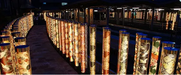 这是一处适合女性旅行的新晋网红景点,想随处都可以拍到美美的照片,到岚山站的新景点和服森林就是了。这里排列的都是被京友禅的布料包裹的杆子。夜晚点灯之后,就成了必拍的景点!特别是穿着和服步入其中,会完美的融入其中,尽显女性的柔美。