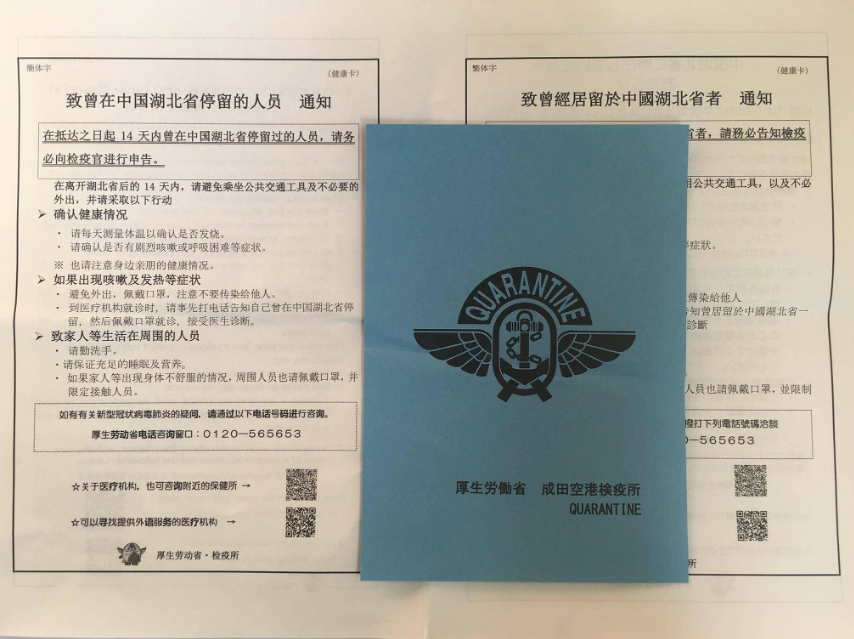 飞机降落在日本后,日本的机场为来自中国的旅客安排了单独的检验检疫入口,在过检之前有机场工作人员会跟每一位旅客确认健康问卷上的信息,如果没有发现异常,则会发放一个蓝标和一份《通知》。