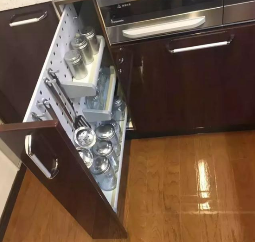 要注重厨房空间的有效利用,顶厨吊柜是必不可少的。在日式厨房里,吊柜通常会做成下拉、升降式的,这样使用便利性就得到了瞬间提高,也完全避免了主妇个子矮够不到吊柜的问题。这种升降吊柜的零配件质量优异,也完全不用担心吊柜会被拉坏的问题,收纳功能与人性化设计在厨房里结合得无可挑剔。