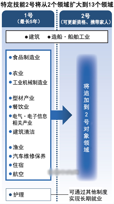 日本政府预测,到2023年度日本的劳动力缺口将达到34.5万,如果取消特定技能签证的期限,将有望缓解劳动力的缺口。拥有实践经验、无需特别教育和培训的人可以获得最长5年的“1号”在留资格,如果通过考试确认拥有能担任现场总管的熟练度,可以获得“2号”在留资格。在留资格可以更新,家人也可以获得逗留资格,在留达到10年就可以获得永住权。此前这一措施仅限定在“建筑”、“造船·船舶工业”这2个领域,以后将扩大到“农业”、“工业机械制造业”、“餐饮业”等14个行业。这样在日本社会基层工作的一线员工,将有望成为“技术型人才”在日本长期在留,也可以获得日本永住待遇了。