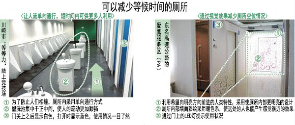 另外,有时里面的如厕位不能有效被利用,是因为外侧人多堵住了通道,如果厕所内使用单向通行的方式,也可以有效缓解排队的问题。
