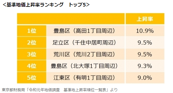 基准地价上涨率最高的是丰岛区(高田1丁目附近)。比上一年度(2019年度)上涨了10%以上。 其次是足立区(千住中居町附近),荒川区(荒川2丁目附近),丰岛区(北大冢1丁目附近),江东区(有明1丁目附近),这些人口密度相对不高、地域相对宽广的地区的地价相对上涨幅度较大,上涨幅度均超过9%。 总体来说,从2017年左右至今,东京的基准地价一直呈缓慢上升的趋势。