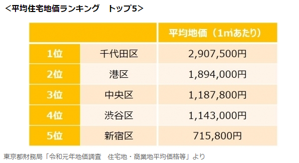 东京23区平均住宅地价排行榜前5位如下:
