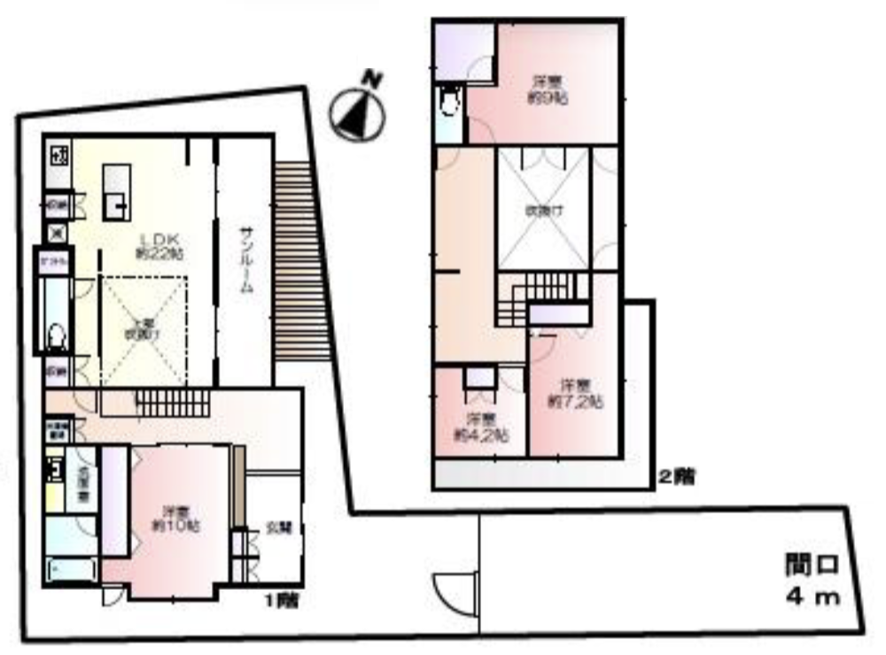 建筑基准法设有“接道义务”,接道义务是指“与宽度4m以上的道路相连接的道路必须在2m以上”。图纸上的“旗杆”部分也就是连接道路宽4m,因此根据此建筑基准法规定,是符合“接道义务”的土地。不仅如此,由于宽幅达4m,所以不仅可以通行,更可以前后停2辆车,要知道在东京能找到有2个停车位的一户建实属不易。
