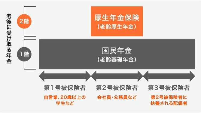 日本的公共养老金由两部分组成,即国民养老金和厚生养老金。国民养老金是指住在日本国内的所有20岁以上未满60岁的人都有义务加入的养老金体系(包括外国人)。每个人将来能够得到的养老金金额将根据保险缴纳的期间决定。
