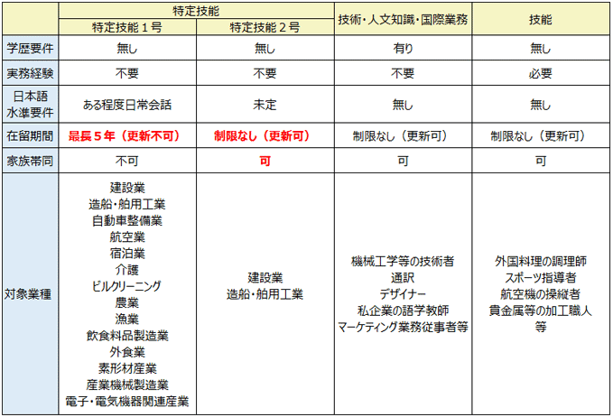 不过,“特定技能签证”和“技术・人文知识・国际业务签证”、“经营管理签证”不同之处在于,对外国人没有学历及实务经验的要求。“特定技能”分为两种类型,即特定技能1号和特定技能2号。