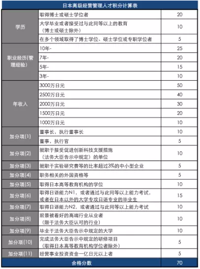 正常情况下,在日本工作生活满五年可申请入籍日本,满10年可申请日本永住。不过对于高度经营管理人才,日本政府还开通了绿色通道,根据评分系统,如果每年的收入达到1000万日元以上(约年薪52万人民币)的标准,可以相应有额外的加分。当整体评分标准达到80分时,在日本生活满1年即可申请永住;达到70分时在日本生活满3年即可申请永住,这样大大缩短了申请永住的时间。
