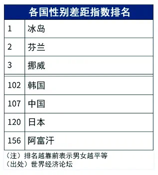根据世界经济论坛(WEF)发布的“性别差距指数”排行榜中可以显示各个国家实现男女平等的程度。日本在2020年度参与调查的156个国家中,排名第120位。日本女性在政治及经济参与度等方面明显落后,大大降低了日本的排名。