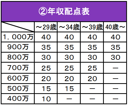 比如,在年收加分项中:29岁以下年薪最低400万日元即可有10分;34岁以下年薪最低500万可得15分;39岁以下年薪最低600万可得20分;而到40岁以上年薪最低要达到800万才有30分。