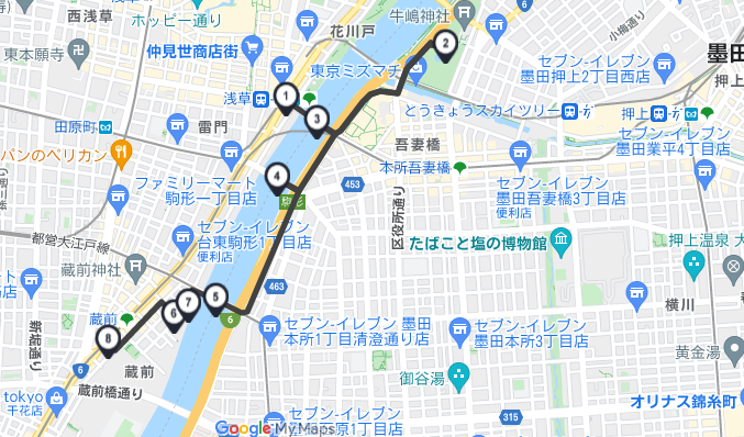 隅田川是荒川最重要的支流之一,途经东京都的北区、足立区、荒川区、墨田区、台东区、江东区、中央区,是贯穿东京市中心最宽的河川,所经过的桥梁数量也是最多的。其临近的电车站包括两国站、浅草站、本所吾妻桥站、驹形桥站、藏前站等。