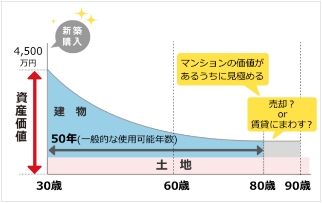 如果在30岁左右结婚时购入一套公寓,那么在公寓的房龄满50年之前可以考虑将房子出售或出租。