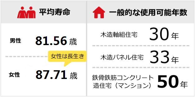 根据日本厚生劳动省公布,2020年日本人的平均寿命为女性87.71岁、男性81.56岁。不但可以看出女性比男性更长寿,且人的寿命比房子的耐用年限长得多。